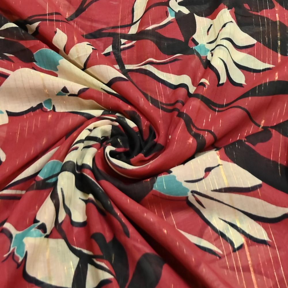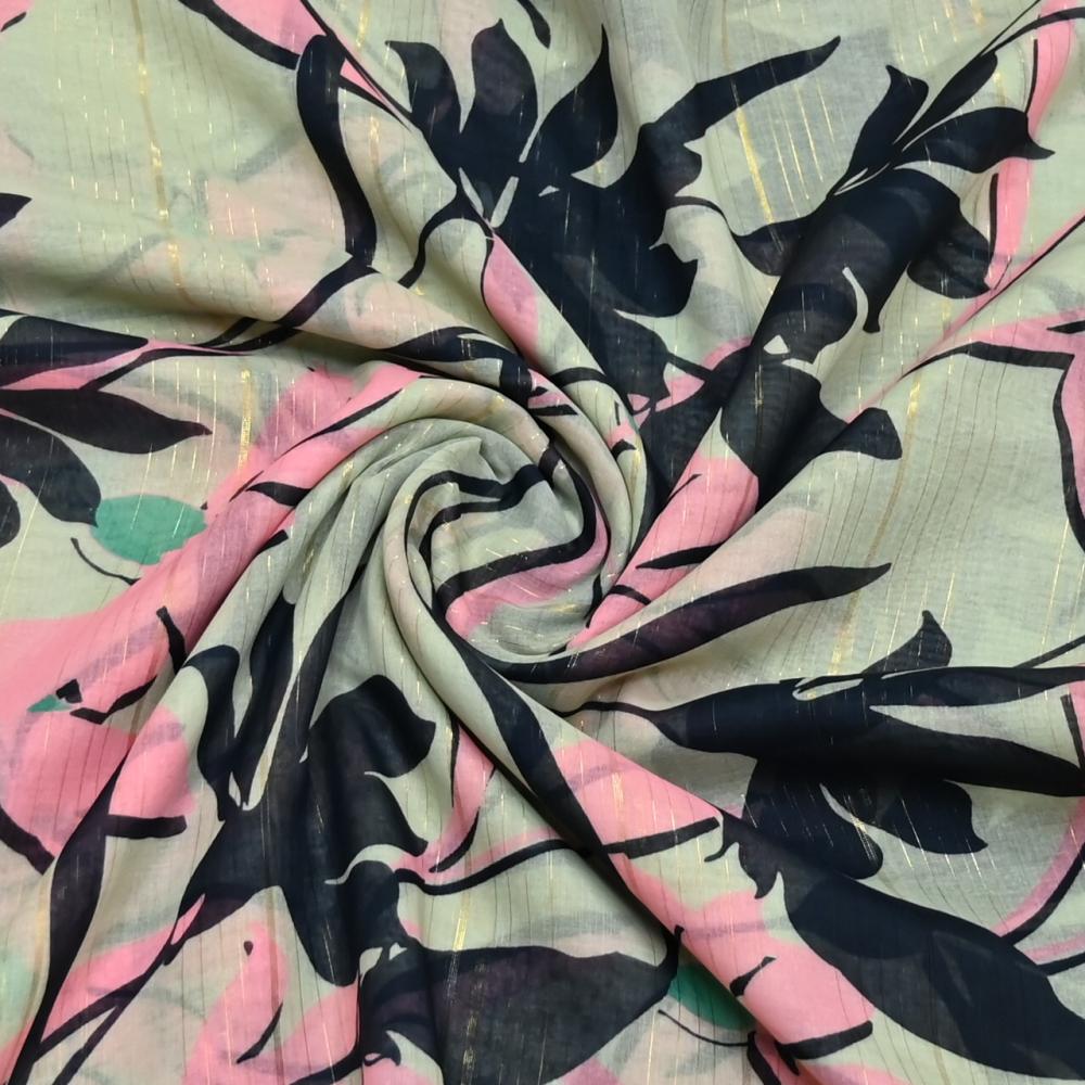 تميزي بإطلالة أنثوية ناعمة مع قماش ابوال الفاخر بنقشة مشجره ملون مضاف اليه لمعة ذهبية تضيف لمسة من الفخامة والجاذبية. القماش يجمع بين النعومة والخفة، مما يجعله مثاليًا للخياطة اليومية أو المناسبات.( شفاف )