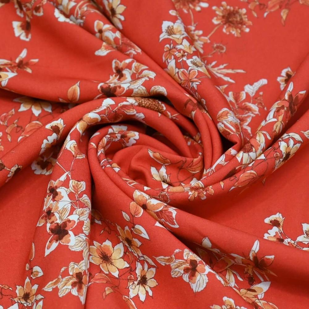 قماش فسكوز فاخر بتصميم زهري أنيق. تتميز النقشة بأزهار صغيرة متناثرة بألوان هادئة من البرتقالي والأصفر والأبيض على خلفية برتقالية زاهية. تعطي هذه الألوان المتناسقة مظهراً دافئاً وعصرياً للقماش. يتميز الفسكوز بملمسه الناعم وخفته، مما يجعله مثاليًا لصناعة الفساتين والبلوزات الصيفية.