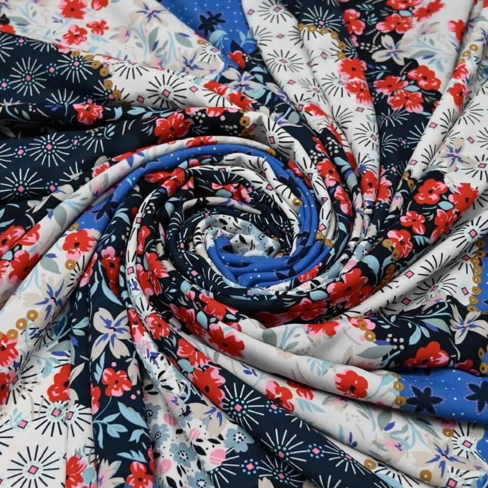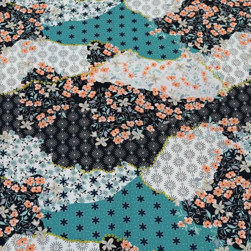 استمتعي بأناقة حديثة وعصرية مع هذا القماش الفيسكوز. يتميز بنقشة زهور مجردة متعددة الألوان مما يخلق مزيجًا جذابًا بين الأناقة والحيوية. النقشة تتكون من قطع زهور صغيرة وكبيرة متداخلة، مما يعطي القماش طابعًا فنيًا وعصريًا القماش ملمسًا ناعمًا وحريريًا ويشعره بالخفة على البشرة. وزن القماش المتوسط وشفافيته الجزئي يجعله مثاليًا لتصميم