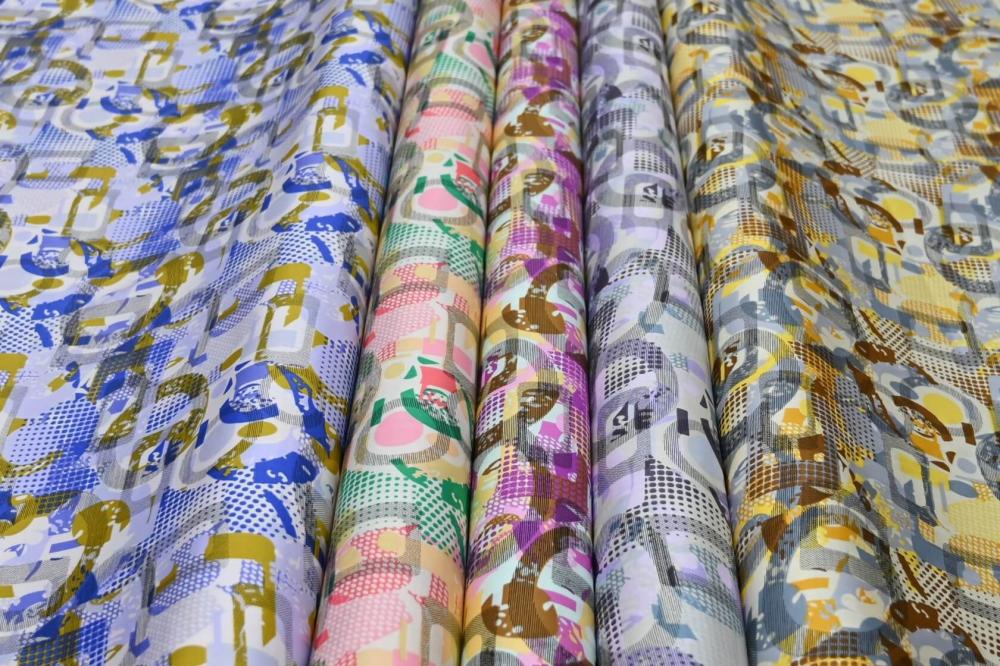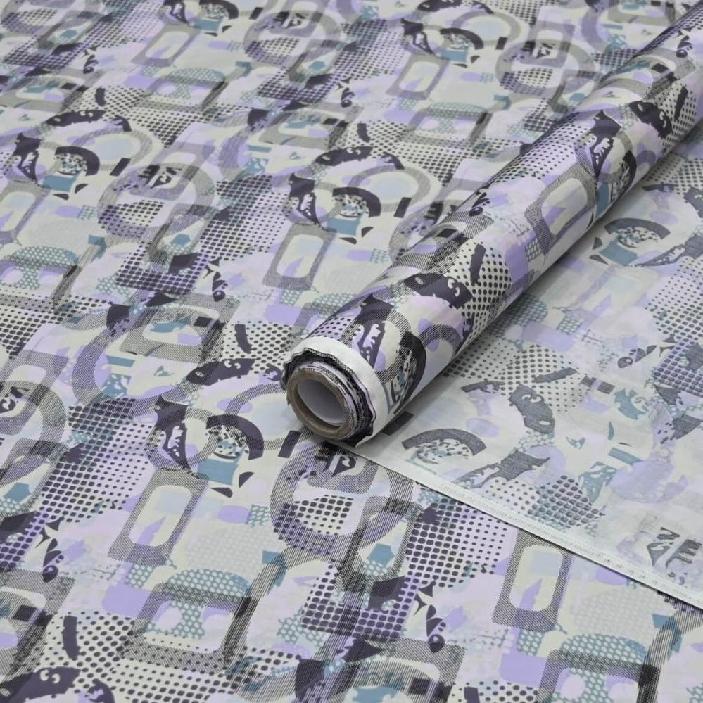 يتميز بنمط تجريدي ومتداخل، حيث تظهر أشكال هندسية وخطوط متشابكة بألوان متعددة. الألوان المستخدمة تشمل الأزرق، الأصفر، البنفسجي، الوردي، الأخضر، والبني، وكل لون يتداخل مع الآخر في نمط شبكي أو منقط يعطي القماش مظهرًا عصريًا وحيويًا. التصميم وكأنه مستوحى من الفن التجريدي مع استخدام الظلال والتدرجات اللونية التي تضيف عمقًا للنمط. القماش يبدو فاخرًا وملائمًا للاستخدام في الأزياء أو التصميمات العصرية.