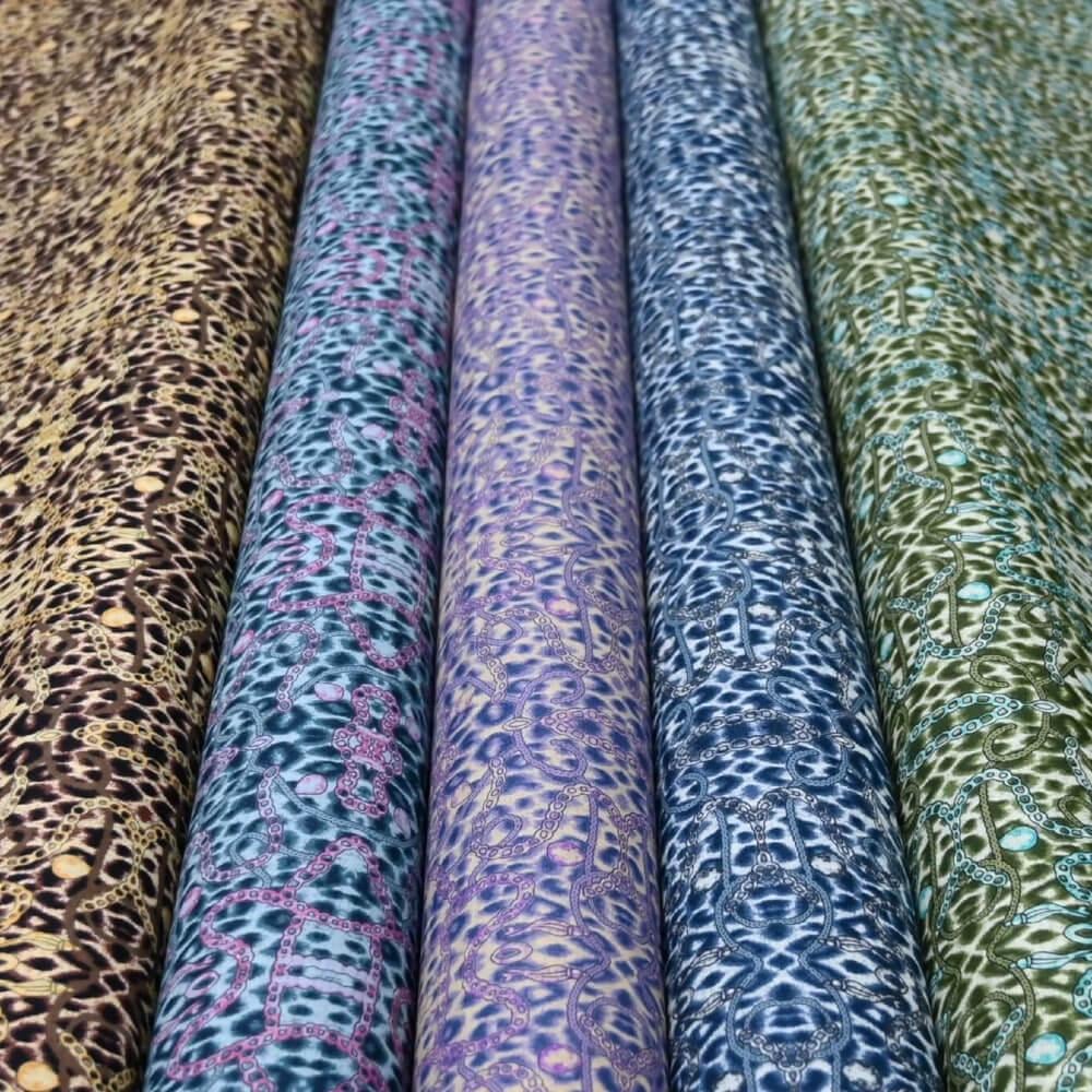 اكتشف فخامة النعومة والراحة مع مجموعتنا الحصرية من أقمشة قطن كيمري العمودي. هذا القماش المصنوع من أجود أنواع القطن 100% يمنحك ملمساً لطيفاً على البشرة، وتهوية مثالية تُناسب جميع الأجواء تتميز هذه التشكيلة بنقوشها الفريدة والجذابة التي تُضفي لمسة من الأناقة والتميز على القماش. تأتي النقوش على شكل طبعات جلد النمر أو الفهد بتدرجات لونية عصرية، ما يمنحك خيارات واسعة لتصميم ملابس عصرية ومواكبة لأحدث صيحات الموضة.