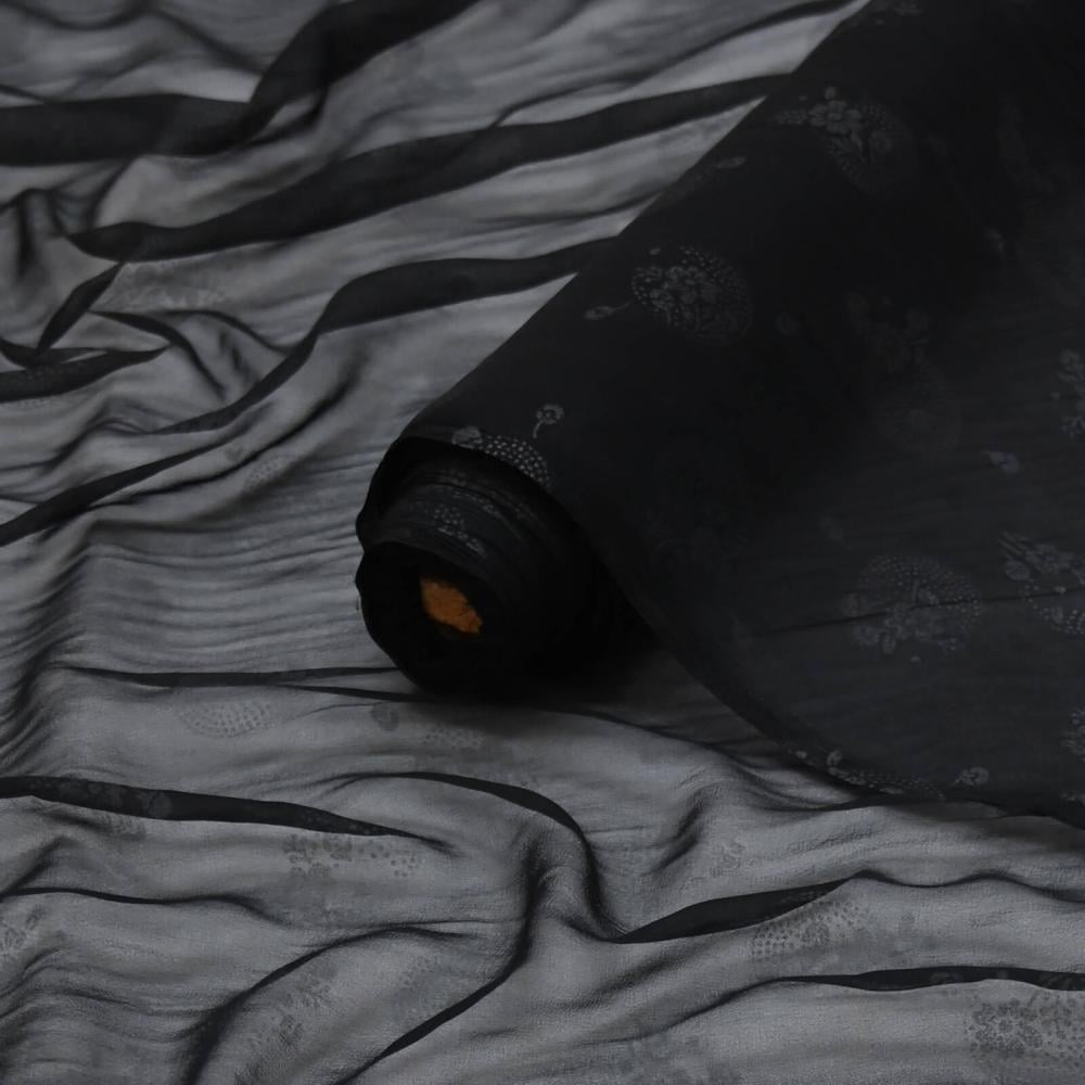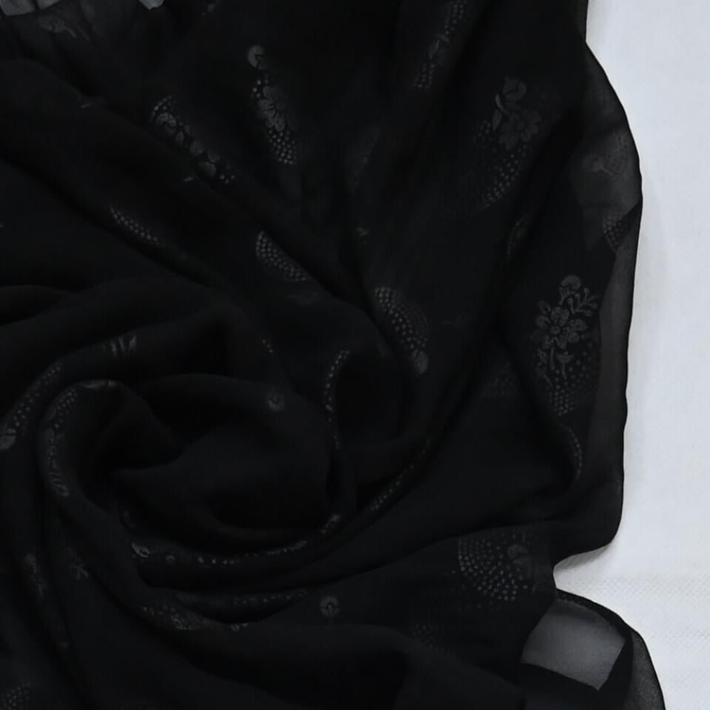 قماش طرح شيفون مشجر ياباني فاخر يتميز بنعومته وانسداله الأنيق ولمسته الخفيفة التي تضيف لمسة فخمة لأي إطلالة. القماش يأتي بلون أسود أنيق مع نقوش ناعمة متداخلة تمنح الطرحة مظهراً راقياً ومميزاً يناسب الاستخدام اليومي والمناسبات الخاصة.