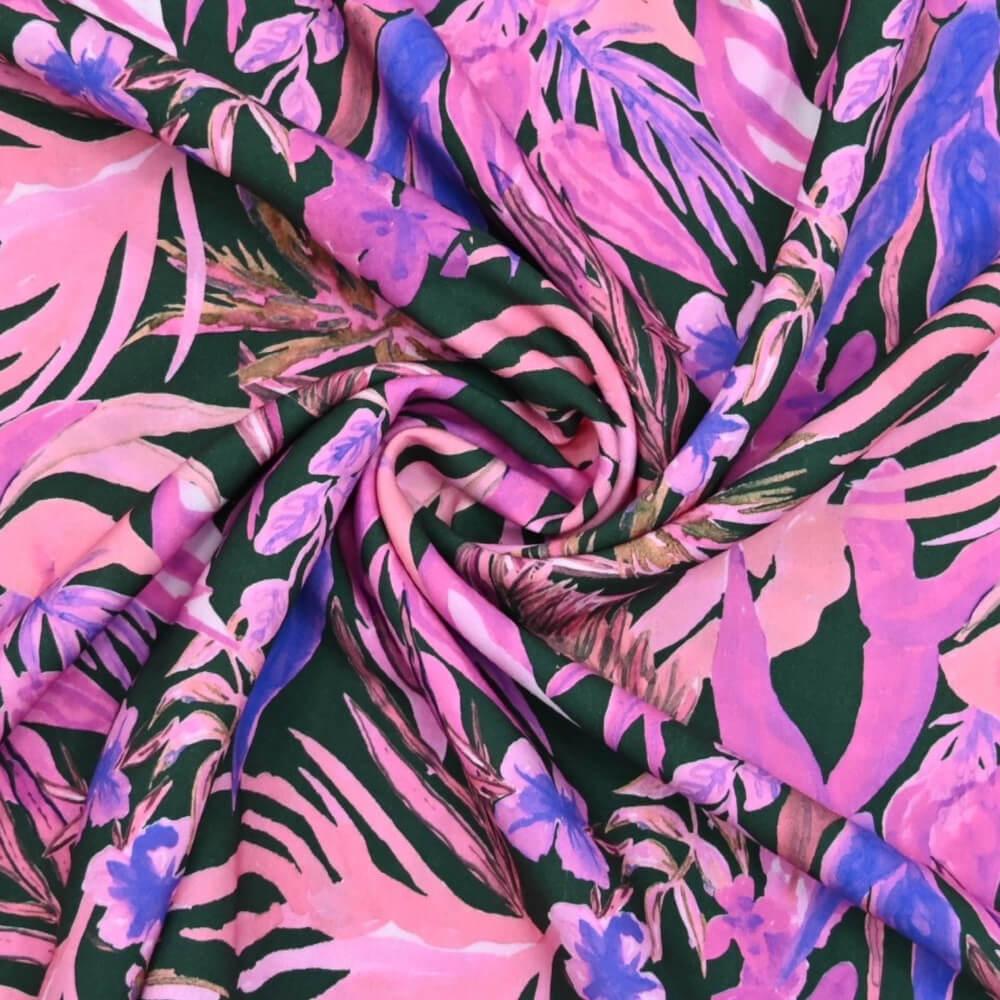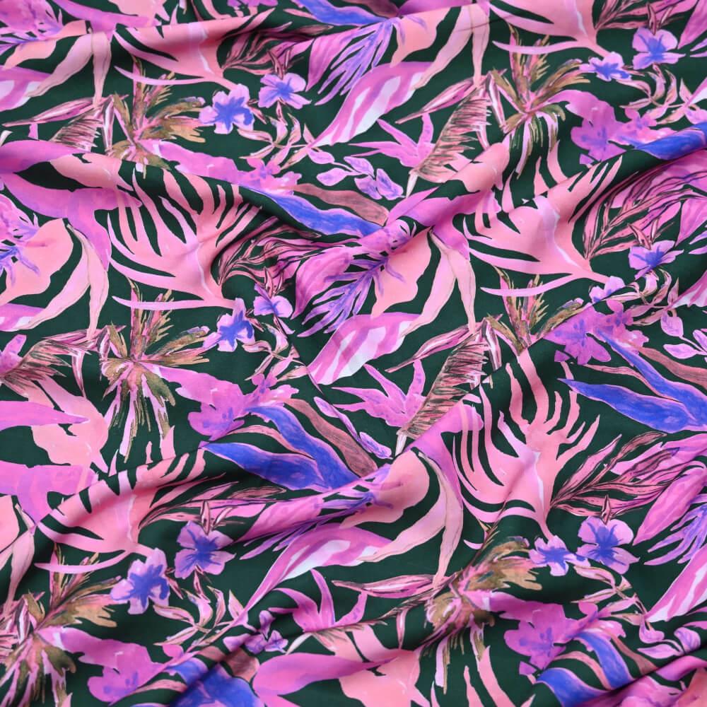 قماش فسكوز مزين بنقشة زهور كبيرة بألوان زاهية. الزهور محاطة بخطوط سوداء رفيعة، مما يبرز الألوان الزاهية مما يضفي على القماش مظهراً أنيقاً."