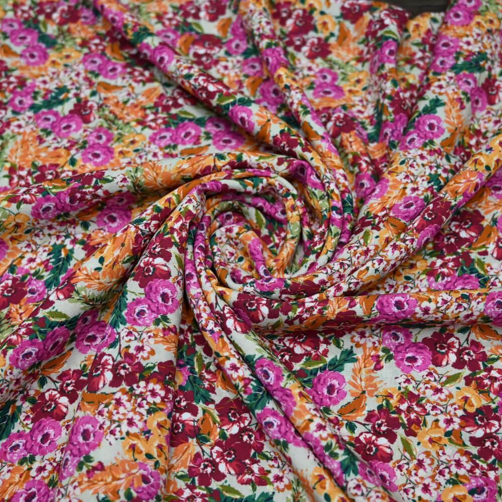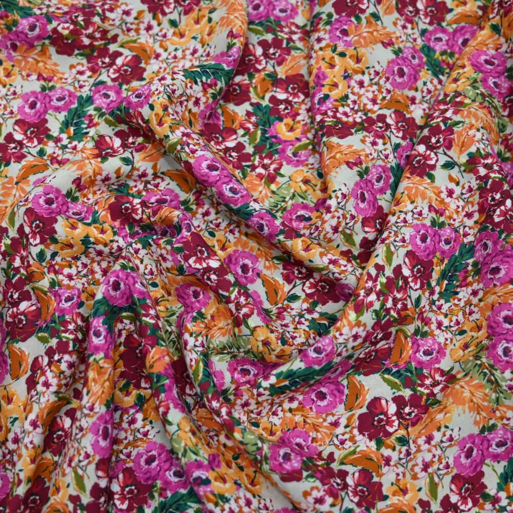 قماش فسكوز بنقشات زهور ملونة زاهية قماش خفيف الوزن وناعم الملمس، يتميز بنقشات زهور كبيرة ومتوسطة الحجم بألوان زاهية ومتنوعة مثل الأحمر والوردي والأصفر والأرجواني، موزعة بشكل كثيف على كامل القماش
