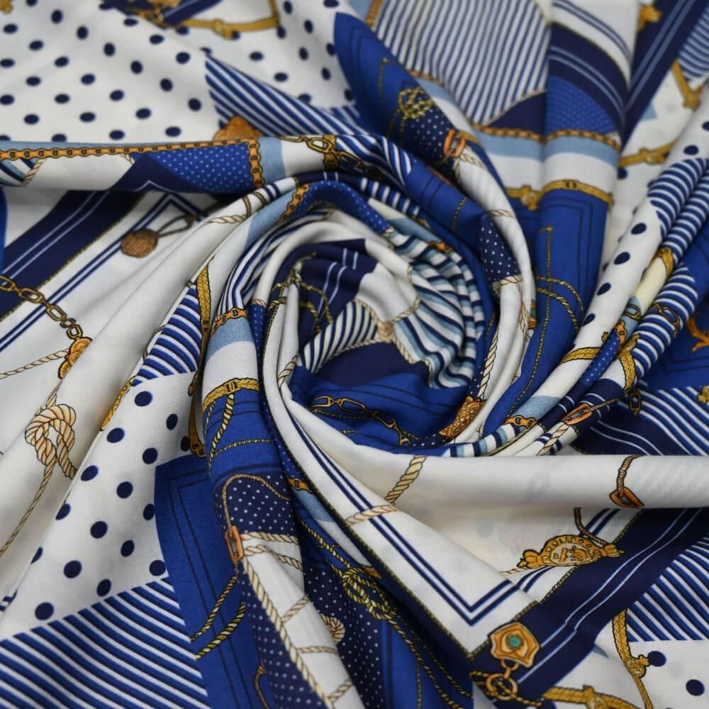 قماش فيسكوز المميز مصنوع من الفسكوز مما يمنحه ملمسًا ناعمًا وحريريًا. يتميز بتصميم جذاب يجمع بين الألوان الزاهية مثل الأزرق والأحمر والأبيض والأخضر، مع طباعات العقد والأشكال الهندسية. هذا المزيج من الألوان يضفي على القماش طابعًا جميل